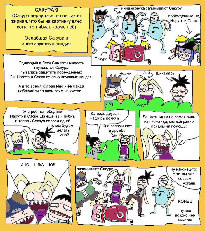 улыбнуло)) хоть я очень люблю "Наруто", но иногда добивает серьезное поведение персонажей, а в Тупаой Сакуре все как есть)))) всех вывели на чистую воду)))