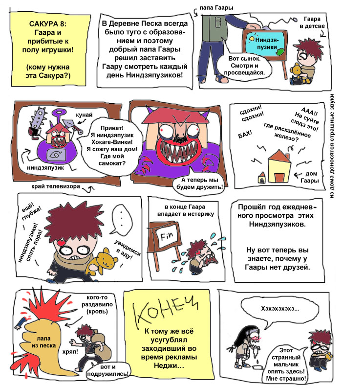 Такие глупые, примитивные шутки...просто безмозглый человек, искренно ненавидящий Саске и Сакуру, настряпал пару страничек "офигенных приколов" и все ржут от такого примитива (явно второклашки, любящие шутки "про пукание" и считающие это высшим юмором). Пфф...как глупо... А вот пародия на опенинги даже очень ничего...
